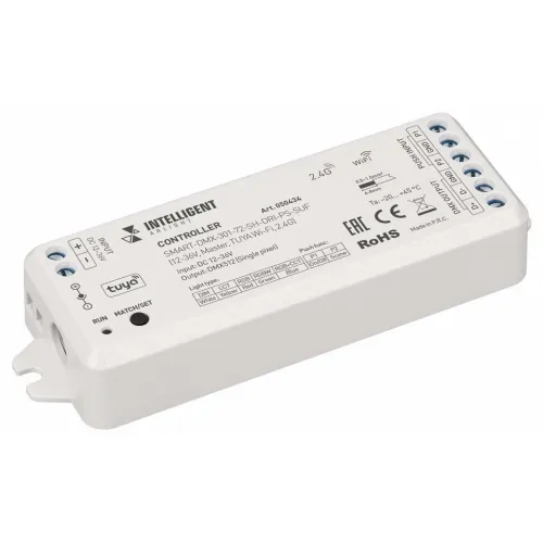 | Характеристики | контроллер совместим с пультами SMART-SPI по радиоканалу 2.4G, устройством можно управлять по сети WiFi через смартфон с помощью приложения INTELLIGENT ARLIGHT, а также с помощью выносных кнопок возможно управление включением и сценами |