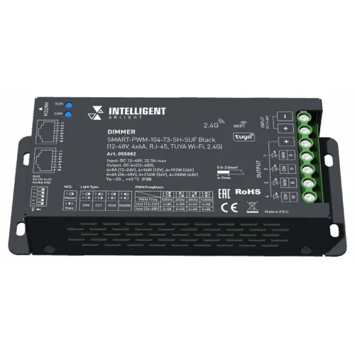 | Характеристики | DIP-переключатели на корпуса для выбора настроек, выбор типа освещения (DIM/CCT/RGB/RGBW), выбор частоты ШИМ (0.5-16kHz), выбор режима Master/Slave, синхронизация по DMX512 через порт RJ45, управляется пультами и панелями серии SMART по RF 2.4G, доступно управление TUYA WiFi в приложении INTELLIGENT ARLIGHT |